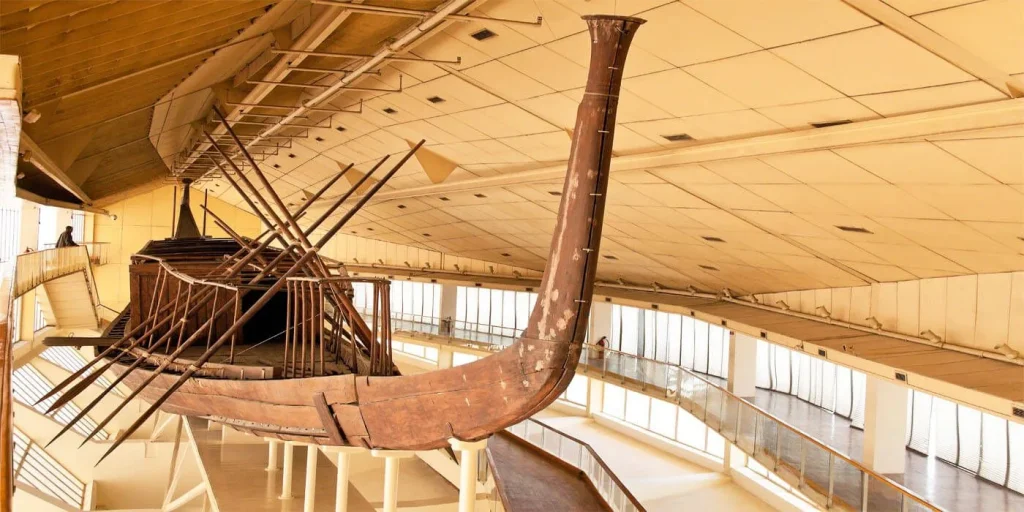 En 1954, el arqueólogo egipcio Kamal el-Mallakh realizó un descubrimiento revolucionario cerca del lado sur de la Gran Pirámide. Enterradas en un pozo sellado, se encontraron cientos de piezas de madera, perfectamente conservadas en la arena seca del desierto. Tras años de meticulosa restauración, las piezas fueron ensambladas nuevamente para formar un barco a tamaño real, de más de 43 metros de longitud. La artesanía era tan precisa que no se utilizaron clavos de metal; únicamente clavijas de madera y cuerdas mantenían toda la estructura unida.